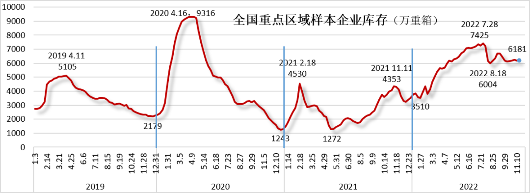截止11月中旬,浮法玻璃全國重點區(qū)域樣本企業(yè)庫存6180萬重箱,比上周有0.06%的微幅下降,與10月底基本持平;比21、20年同期分別+43%/+198%。
