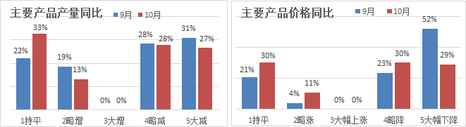 10月份浮法玻璃產(chǎn)量與上月基本持平,當月平均產(chǎn)銷率94%,總體庫存略有增長;10月份原燃料價格比上月基本持平,企業(yè)預(yù)期后市主要原料價格穩(wěn)中有降,燃料價格一致看漲;10月份普白產(chǎn)品出廠均價83.2元,11月初價格基本持平,后市價格預(yù)期穩(wěn)中略降;10月份浮法企業(yè)仍普遍虧損,后兩月也難以扭虧。