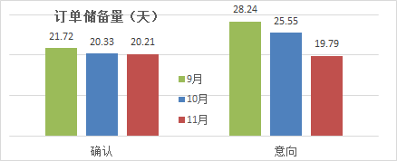 2)意向訂單量:本月統(tǒng)計的意向訂單弱化幅度明顯,受訪企業(yè)均值不足20天,較上月減少了近8天的量;低儲備(10天以下)占比增加了8個百分點,中高儲備量(20天以上)的企業(yè)占比由47.5%降至31%,下降16.5個百分點。隨著時間的推移,意向訂單必然日趨走弱。