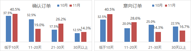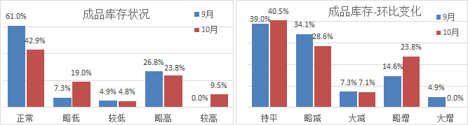 1)已確認訂單量:10月份受訪企業(yè)均值20.21天,與上月基本持平。其中,儲備量低于10天的占比由37.5%增加至40.5%,儲備量11-30天的占比由50%降至45.2%,儲備量30天以上的企業(yè)占比略有1.8個百分點的增加,整體訂單儲備量較前期走弱,與旺季行情有較大反差。