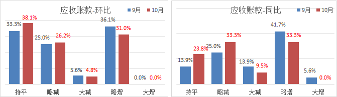5、應(yīng)收賬款:10月受訪企業(yè)應(yīng)收賬款規(guī)模均值3.01個月(應(yīng)收賬款額/本期累計月均銷售額),比上月增加0.35個月:環(huán)比持平的企業(yè)占比38.1%,比上月比例略有增加;環(huán)比減少的企業(yè)占比31%,與上月持平;環(huán)比增加的企業(yè)占比31%,比上月比例下降5.1個百分點。同比,持平和減量企業(yè)的占比由52.8%提高到66.6%,同比增加的企業(yè)占比33%,下降14個百分點。環(huán)比、同比均有好轉(zhuǎn),反映出日趨嚴峻的行業(yè)形勢下企業(yè)風控意識和能力有所增強,但臨近年末企業(yè)回款壓力會越來越大。