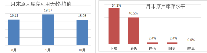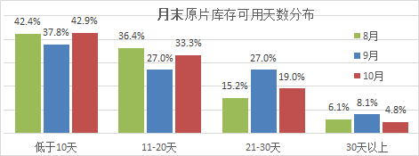 6、加工企業(yè)月末原片庫存:10月份受訪企業(yè)原片庫存可用天數(shù)均值15.95天,比上月下降3.4天;其中43%的企業(yè)“低于10天”,比上月增加5.1個百分點;33%的企業(yè) “11-20天”,比上月提高6.3天;超過20天的僅23.8%,比上月下降11.3百分點;當前加工廠原片庫存較前期有所減少,55%的企業(yè)處于“正常”水平,43%的企業(yè)反映“偏低”,2.4%的極少數(shù)企業(yè)“偏高”。供給過剩,下游選擇余地大,后期,多數(shù)企業(yè)仍是“隨用隨進”無意增加庫存。
