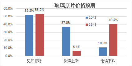 1)原片價格:本月正值旺季,但現(xiàn)實表現(xiàn)改變了市場預(yù)期,形成“穩(wěn)中有跌”的一致性預(yù)期,與浮法企業(yè)預(yù)期較為一致。受訪企業(yè)中,53.2%的企業(yè)預(yù)期“見底持穩(wěn)”,比上月略有提高;6.4%的企業(yè)預(yù)期“反彈上漲”,比上月比例大幅降低30個百分點;40%的企業(yè)預(yù)期“繼續(xù)下跌”,比上月大幅增加29個百分點;