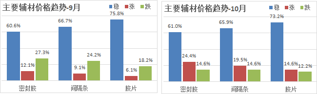 2)主要輔材:本月企業(yè)對主要輔材的價格走勢預(yù)期仍是一致看穩(wěn),看穩(wěn)平均占比67%,看漲平均占比19.5%,比上月比上月增加49個百分點;本月看跌比例下降9個百分點,尤其密封膠看漲和看跌的比例變化較大。